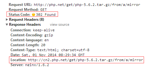 當用戶發(fā)來請求的時候,Web服務器通過修改HTTP響應頭中的Location標記來返回一個新的url,然后瀏覽器再繼續(xù)請求這個新url,實際上就是頁面重定向。通過重定向,來達到“負載均衡”的目標。例如,我們在下載PHP源碼包的時候,點擊下載鏈接時,為了解決不同國家和地域下載速度的問題,它會返回一個離我們近的下載地址。重定向的HTTP返回碼是302,如下圖:
