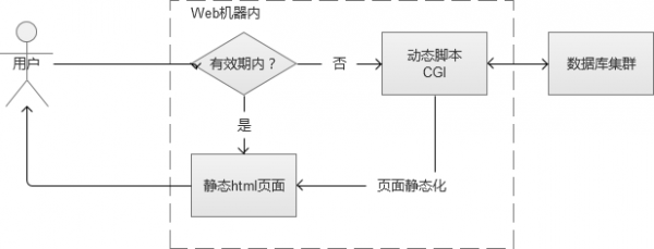 用戶訪問網(wǎng)站的某個頁面,頁面上的大部分內容在很長一段時間內,可能都是沒有變化的。例如一篇新聞報道,一旦發(fā)布幾乎是不會修改內容的。這樣的話,通過CGI生成的靜態(tài)html頁面緩存到Web服務器的磁盤本地。除了第一次,是通過動態(tài)CGI查詢數(shù)據(jù)庫獲取之外,之后都直接將本地磁盤文件返回給用戶。